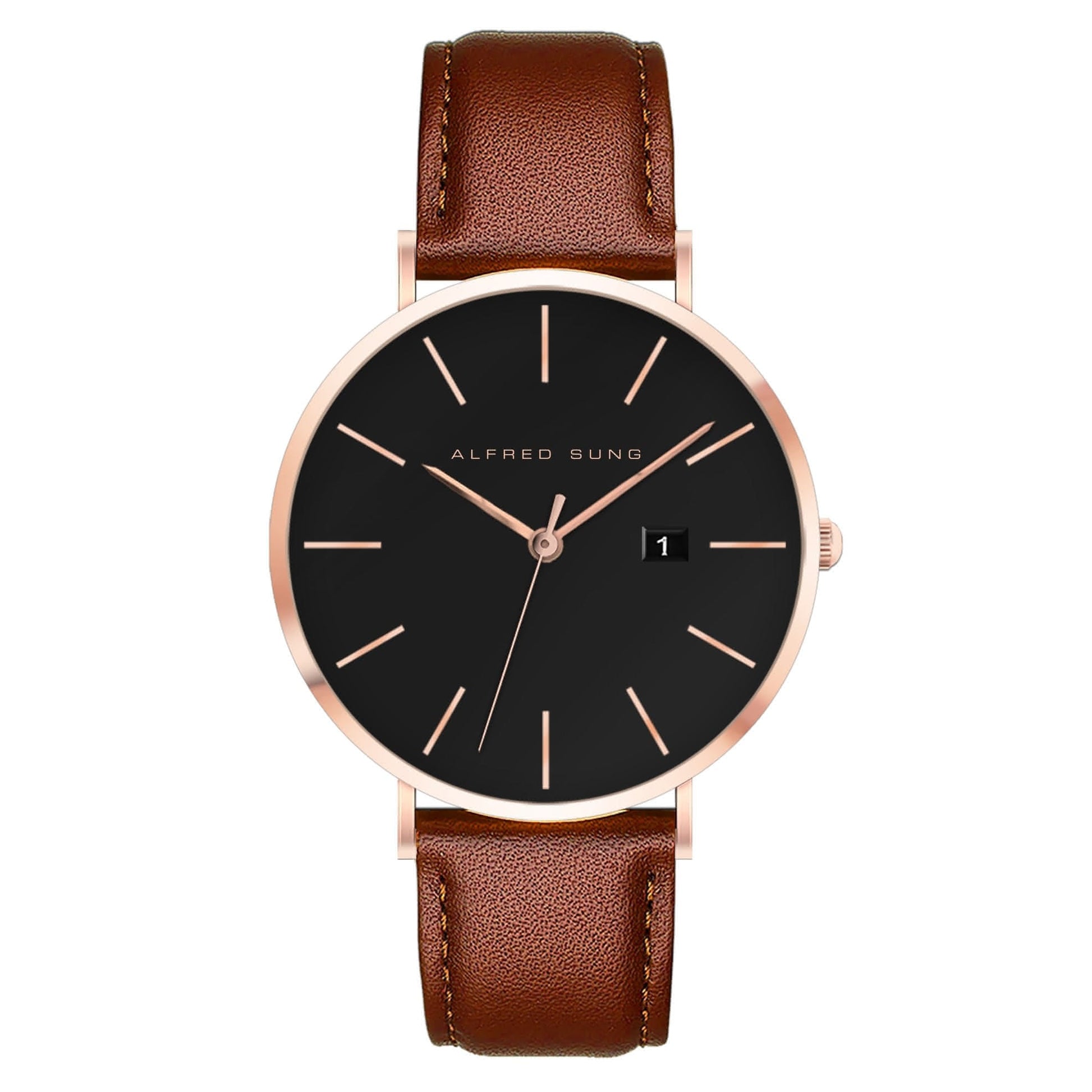 Elevate your style with the Alfred Sung Metropolitan Men's Wristwatch. This exquisite timepiece features a 42mm round rosegold case, perfectly complemented by a sleek black dial and a luxurious brown Italian leather strap. The slim design and interchangeable strap offer versatility, while the date function adds practicality. Crafted with precision and elegance, this watch is a testament to Alfred Sung's dedication to timeless sophistication and modern design.ย ย ย