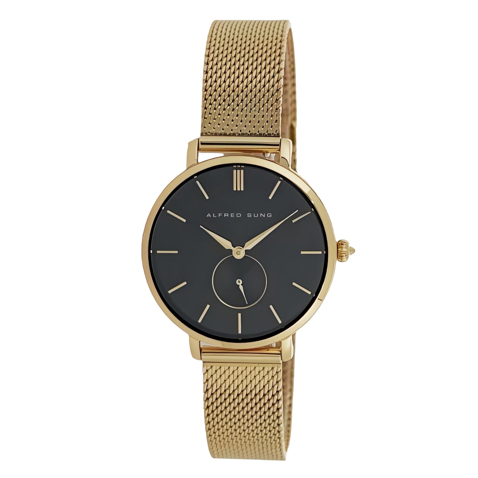 Elevate your style with the Alfred Sung Serenity Ladies Wristwatch. This exquisite timepiece features a 33mm round gold case and a matching gold stainless steel bracelet, exuding timeless elegance. The black dial, adorned with a sub-dial and second hand, showcases Japanese movement for precise timekeeping. Perfect for those who appreciate classic aesthetics, this watch seamlessly blends functionality with sophisticated design.ย ย ย